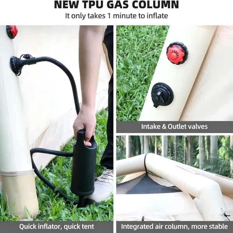 【Стабильная ветрозащитная конструкция】Цельная воздушная колонна из ТПУ, оснащенная веревками и наземными шипами, обеспечивает превосходную устойчивость к ветру, а цельная конструкция палатки оптимизирует ваши впечатления на свежем воздухе.